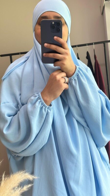 This Ruhi Two piece jilbab in Sky Blue is crafted with soft, breathable fabric and comes in a calming sky blue color.