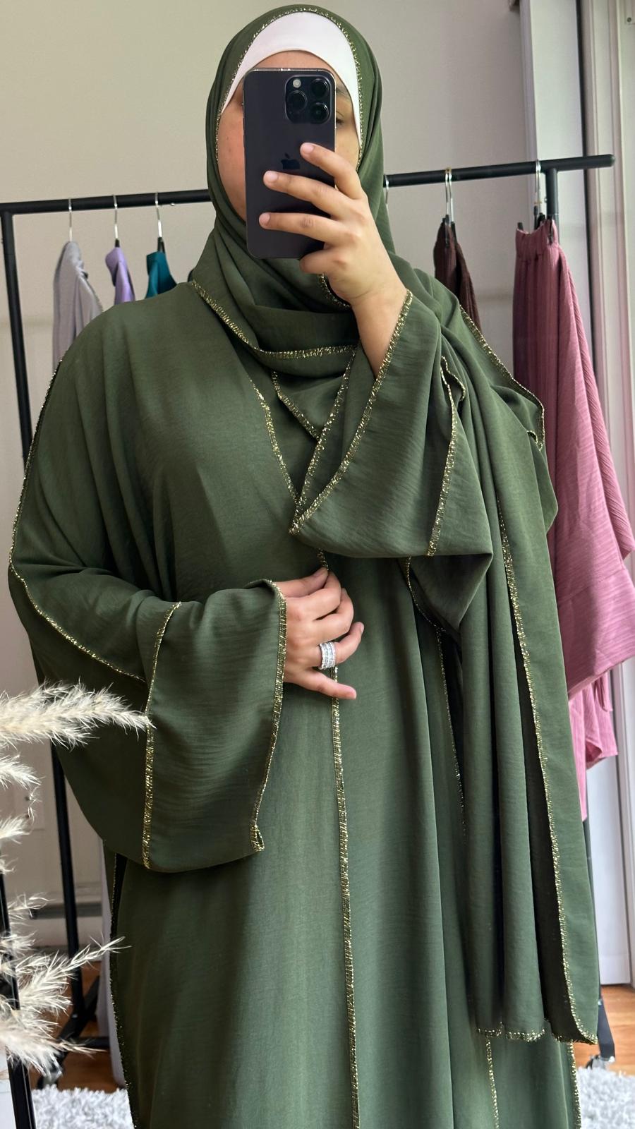 Discover the elegant, versatile Zoya Three piece Abaya in Dark Green colour. Made with high-quality materials, this abaya offers both comfort and style. The three-piece design allows for easy layering and customization, making it a practical and fashionable addition to any wardrobe. Perfect for all occasions.