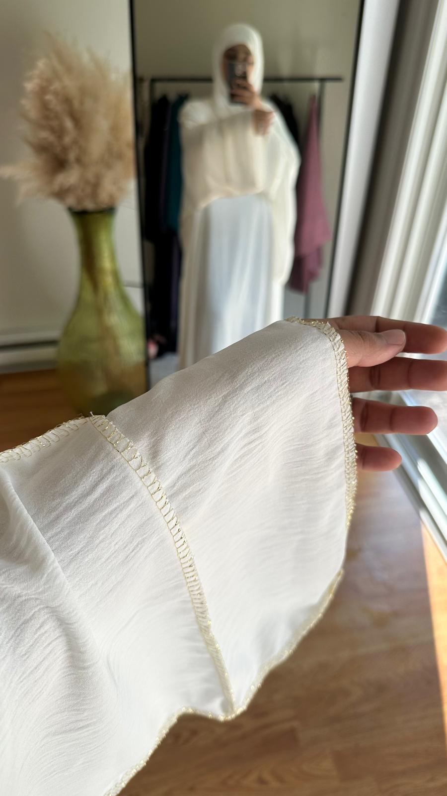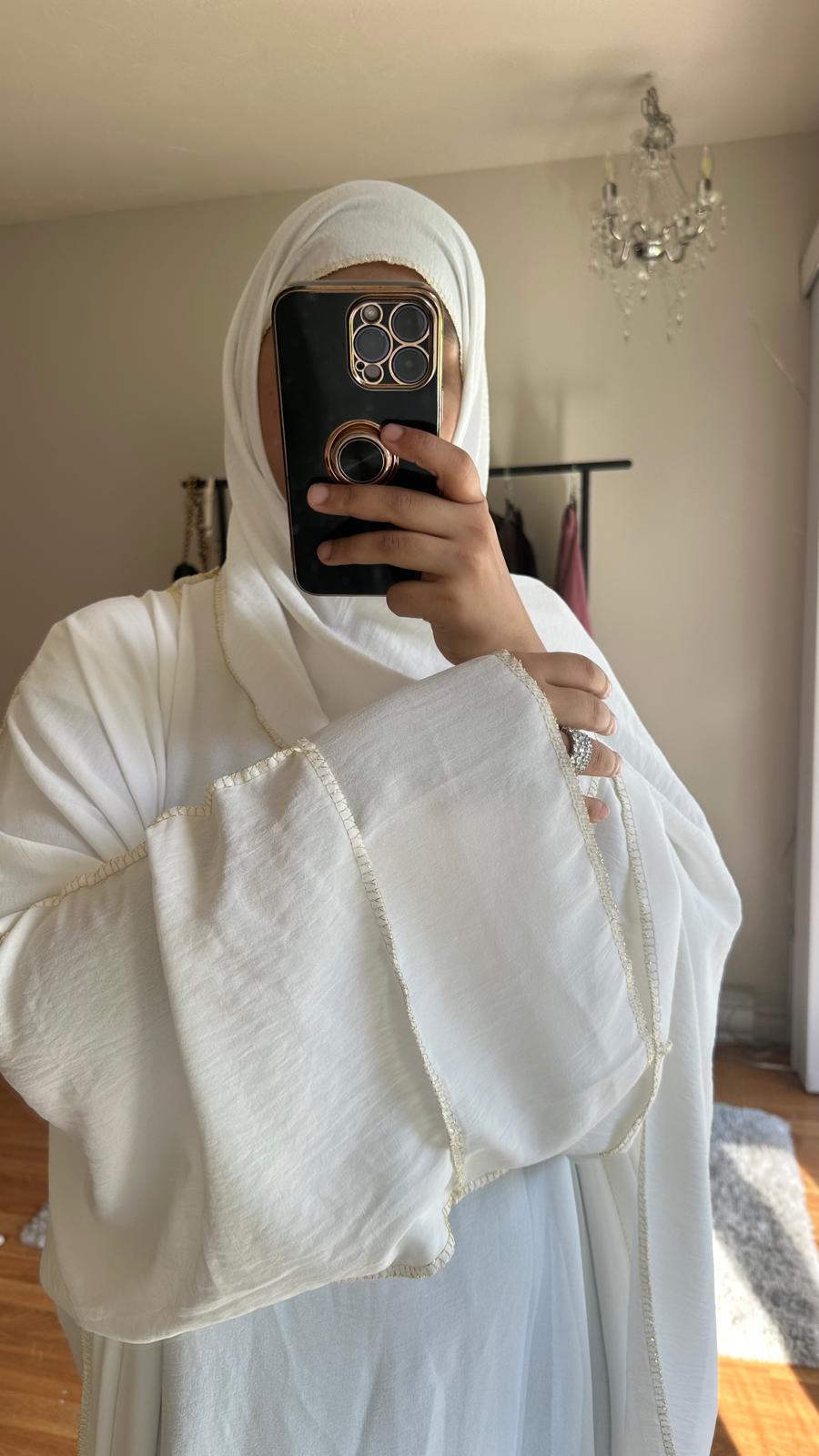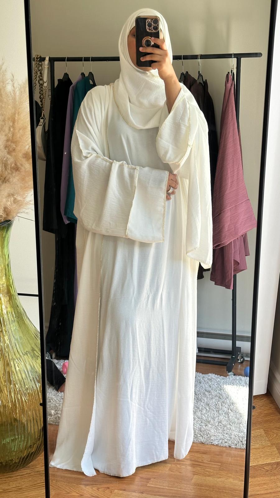 Discover the elegant, versatile Zoya Three piece Abaya in White colour. Made with high-quality materials, this abaya offers both comfort and style. The three-piece design allows for easy layering and customization, making it a practical and fashionable addition to any wardrobe. Perfect for all occasions.